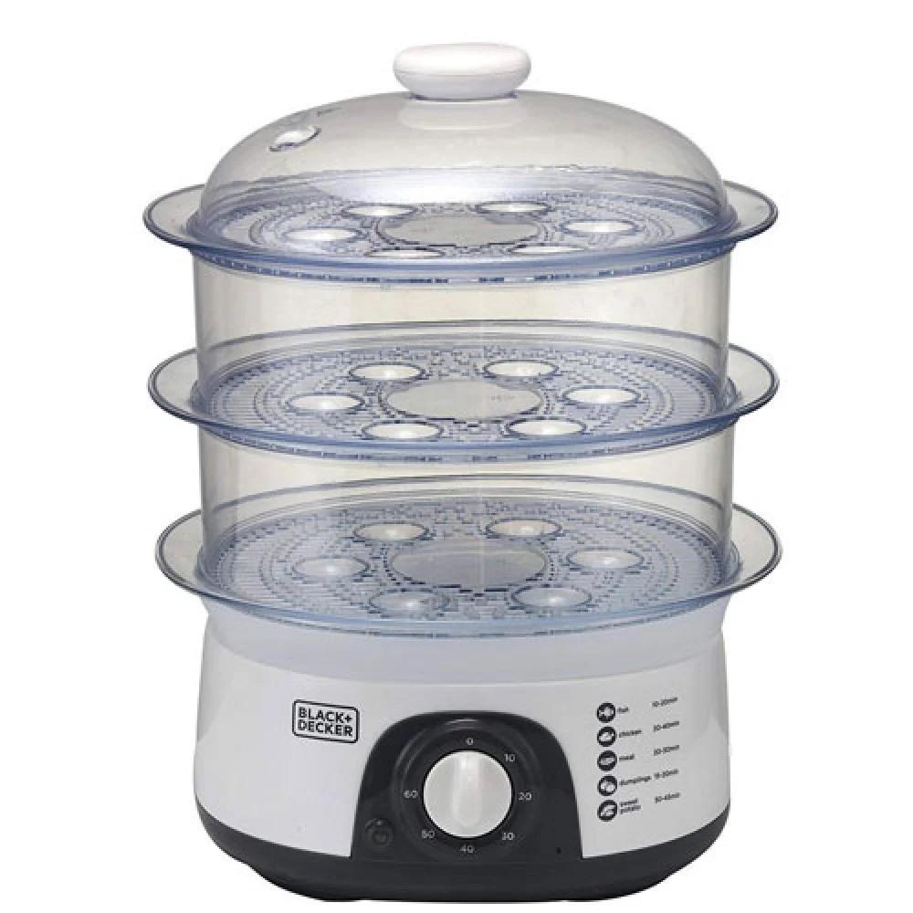 The Black+Decker 3-Tier Food Steamer comes with pre-programmed steam settings to prepare food in a convenient manner. It has a simple construction that allows easy washing. Enjoy healthy delicacies made in these steamers. Made of superior quality material, these steamers are strong and will last for ages. A must-have in every health conscious person's house, these stylish steamers will complement any modern kitchen collection. Black+Decker food steamer allows you to prepare tasty and healthy food with the minimal use of oil. Say no to fatty food and its side effects! Choose the Black+Decker HS6000 B5 3 Tier Food Steamer that allows you to prepare lip smacking dishes for your family and friends. It features stackable steaming bowls with a capacity of 10L, which makes it a perfect device even when you have to cook for a moderately large number of people. This steamer features three tiers so that you can make a variety of preparations like steamed fish, chicken, vegetables and so on, all at once. Furthermore, this Black and Decker food steamer flaunts a compact and sturdy design so that you can conveniently place it on your kitchen platform. Cook in this functional and efficient steamer and save yourself from long cooking hours. Key Features Voltage 220-240 V Weight 1.98 KG Capacity 10 L Power 775 W Sturdy and Compact This Black and Decker food steamer is made from high quality plastic, which makes it robust and long lasting. This food steamer is easy to use and maintain. Also, it is dishwasher safe, which means you can easily clean this equipment after using it. This powerful steamer consumes only 775W and weighs a mere 1.98 kg, which makes it efficient and perfect for your beautiful and personalized kitchen. Prepare All That You Want This Black and Decker food steamer features a transparent stackable steaming bowl so that you can keep a watch on your food in real time. It has a capacity of 10L so that you can easily cook food for a small get together. This 3 tier food steamer allows you to prepare different types of dishes or even the whole meal, all in a go.