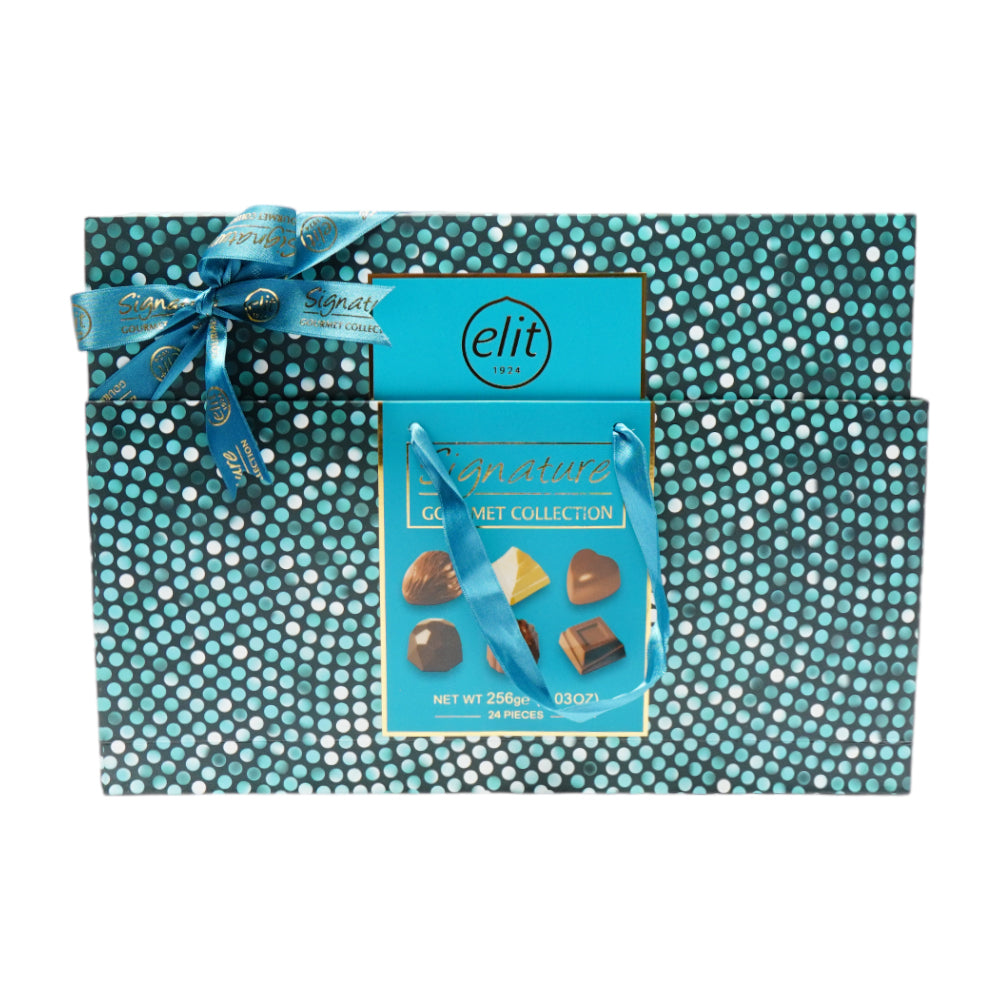 This ELIT Chocolate Signature Gourmet Collection Gold contains 256g of deliciously crafted, luxurious chocolates, perfect for any special occasion. The exquisite selection of chocolates are expertly handmade and feature a variety of creamy milk, white and dark chocolates. With its 25% cocoa content, each bite is sure to delight and satisfy.