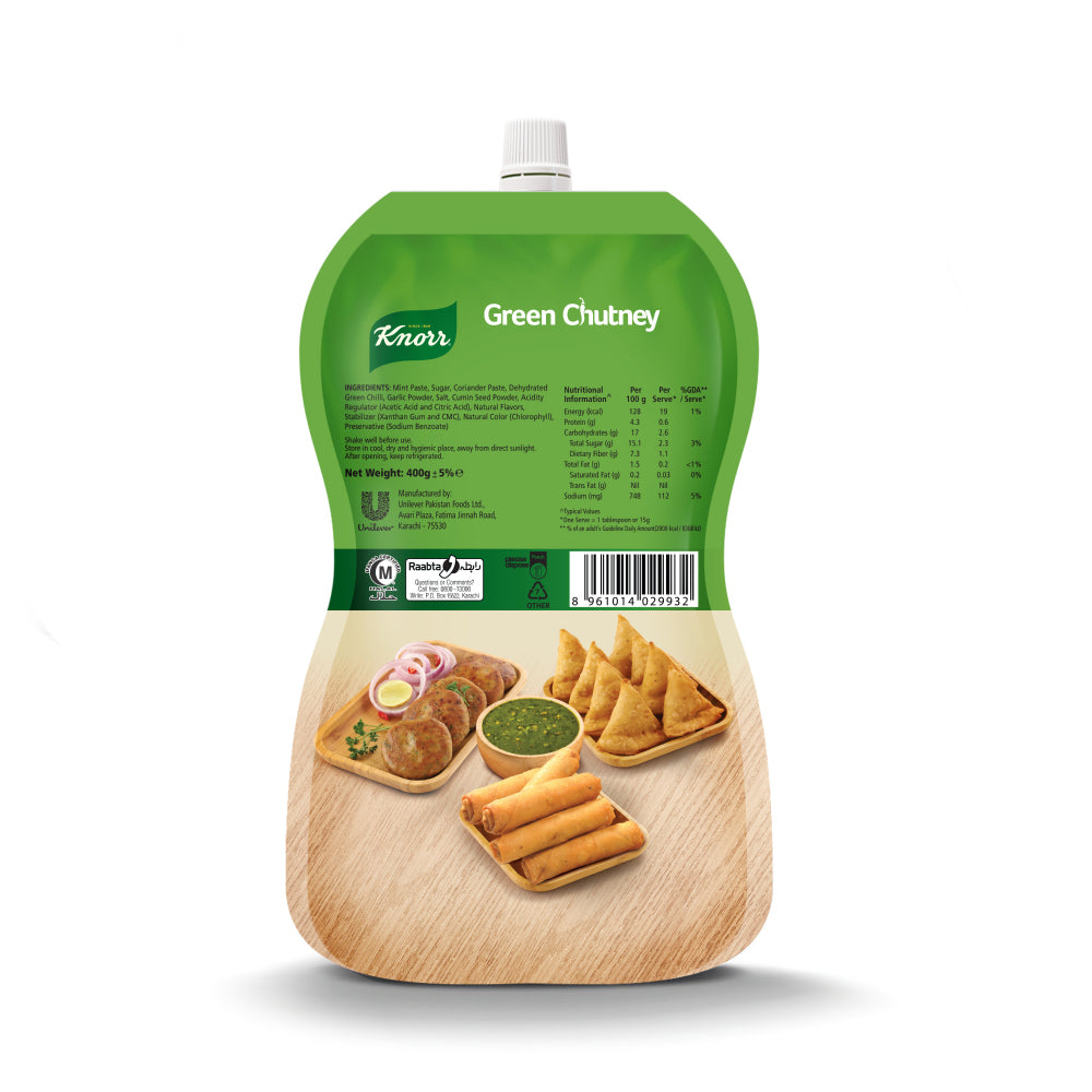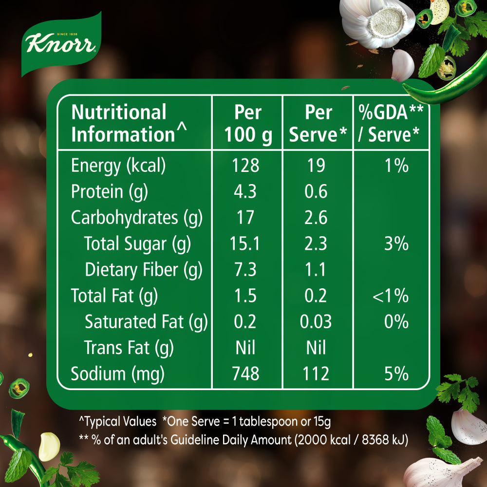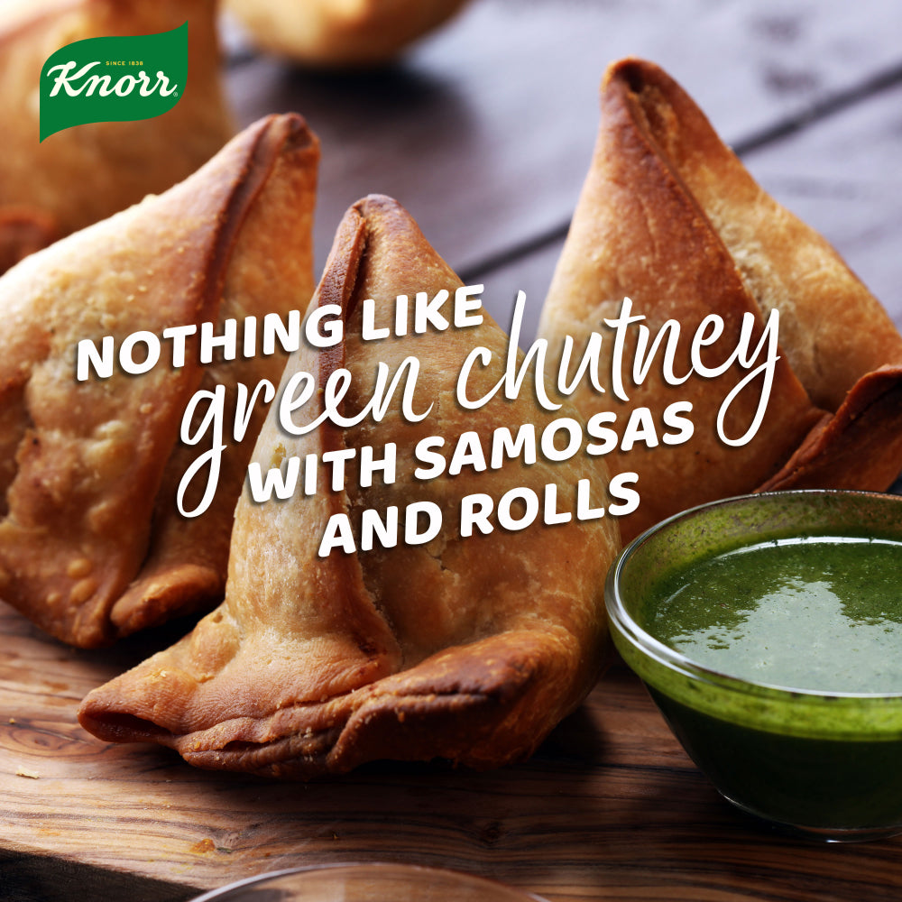KNORR Green Chutney is a creamy blend of coriander, mint, and spices, providing a unique, flavorful and aromatic experience. This 400 gram jar is the perfect accompaniment to your favorite snacks. Enjoy the delicious taste of KNORR Green Chutney today.